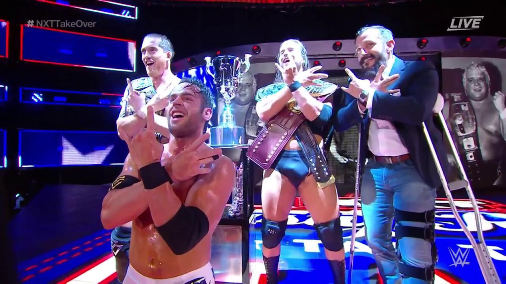 Now of course, nobody really remembers this match for the match itself. The crowd was a little subdued, and sure this was the match that had the least heat going in, but we did have the intrigue of Cole (having been victorious in the earlier ladder match) now having to work double duty (as O’Reilly’s usual tag partner Bobby Fish was injured)… but as we would see, all of the Undisputed Era’s issues were about to be solved…Naturally, AOP firmly put Adam Cole through the announce table pretty early on into the match, he wasn’t seen from again until after the finish… and the match itself was sound. Akam and Rezar were such a great act, particularly with Paul Ellering alongside them, I thought it was such a howler when they left him behind upon their main roster debut. And the two monsters benefited massively from their time in NXT, working alongside some of the best teams around such as DIY and The Revival. Pete Dunne and Roderick Strong as wrestlers speak for themselves, and so it all added up to a relatively fine match, but one that went under 12 minutes. It was with around 10 seconds left that the New Orleans crowd went into fever pitch…As Pete Dunne hit a Bitter End to Kyle O’Reilly, his own tag partner Roderick Strong broke up the pin, and the crowd knew immediately what was coming because they went absolutely APE SHIT with shock and joy. One End Of Heartache later and UE had retained, as Adam Cole looked on and the smile began to appear… Rodrick Strong had indeed made a decision…