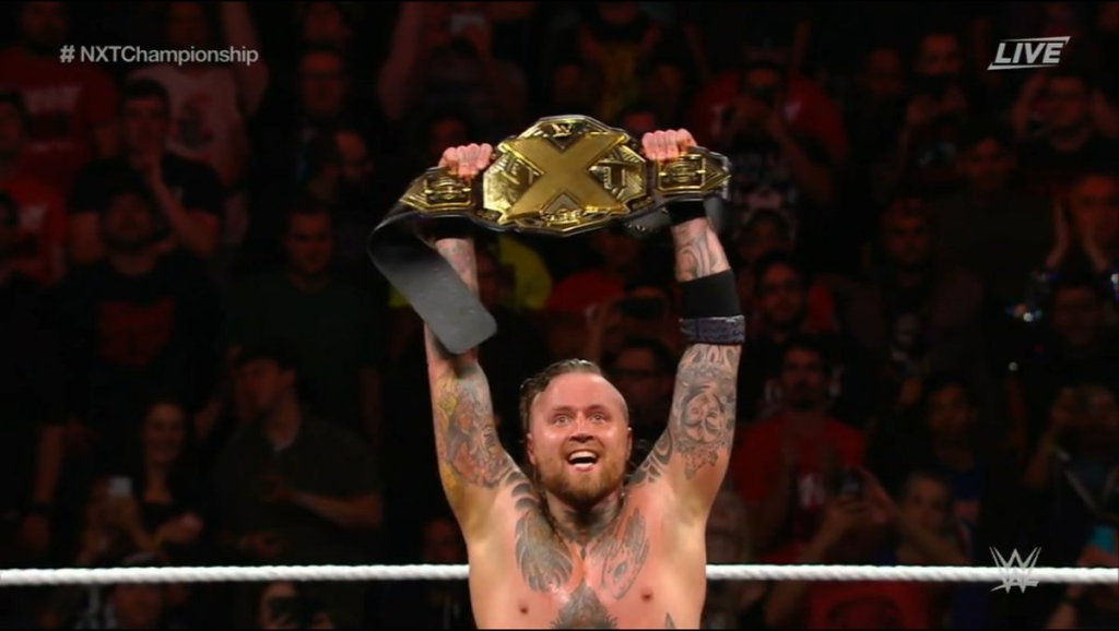 There was, naturally, a few BRUTAL looking spots in this match; two sperate spots involving basically everyone in the match, where a ladder got broken each time and all the guys suffered. Velveteen looked to be busted open at one stage, Lars Sullivan (who was the only person that got booed when they climbed a ladder looking to grab the belt) got busted too, Ricochet did… some Ricochet stuff… I also enjoyed the brief spot where EC3 and Adam Cole looked to team up… until Cole took exception to EC3 trying his own version of Cole’s ‘BAY BAY’ by then picking him up and launching him into a ladder in the corner of the ring. The DVD by Velveteen to Ricochet on the set-up ladder was wild too, the chants of ‘please don’t die’ from the crowd felt app… but at the end of the day, the most over guy in the match got the win, the outstanding wrestler and star in the match, and someone who would continue their run as one of the all-time greats of NXT got the win, and climbed the ladder “like a thief in the night” to become the first ever NXT North American Champion!